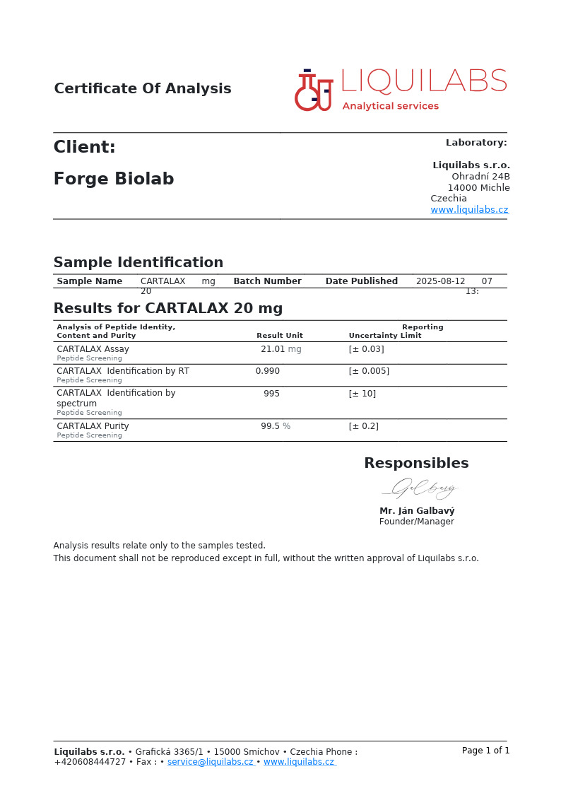 Cartalax promotes the regeneration and protection of cartilage, helping to maintain the resilience and flexibility of joints and soft tissues. By stimulating collagen production and limiting tissue breakdown, it supports long-term tissue health at the cellular level. Additionally, its anti-inflammatory effects help restore balance in connective tissues under stress, which contributes to better cellular recovery, improved structural stability, and enhanced resistance to mechanical or oxidative damage over time.